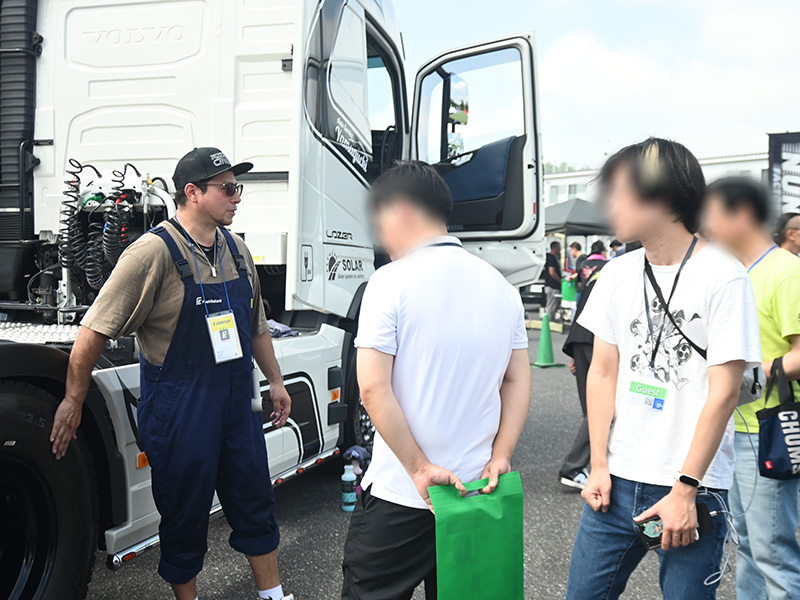 ヨシノ自動車は今年もVOLVOトラクタヘッドのデモカー「電五郎」を展示。乗用車主体のイベントにおいて、ボルボトラックの存在感は圧倒的で、昨年よりもトラックを目的に訪れる来場者が増えた印象です。物流業界で働かれているVOLVOオーナーからは、「一度運転席に座ってみたかった」という喜びの声も寄せられました。