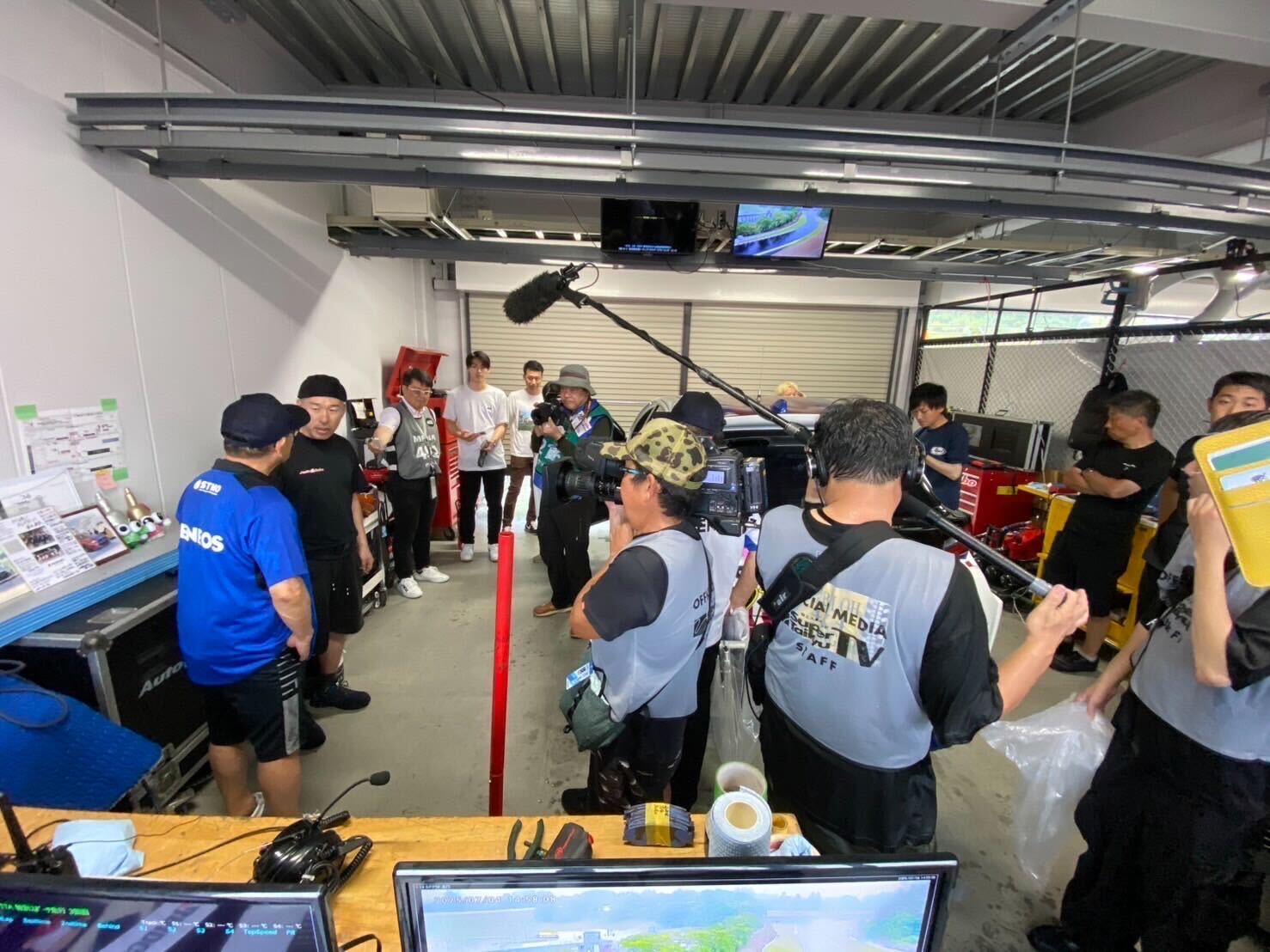 7月3日に茂利選手が単独で走行し、マシンと初コースへの習熟を深めました。翌4日の占有走行1本目では、小尾選手が1分43秒台の好タイムを記録し、他のドライバーも安定した走りを見せ、車両はニュートラルステアで扱いやすい挙動でした。全面改修されたSUGOの路面において、地元であるDドライバー大友選手の知見が全ドライバーのアジャストに貢献しました。占有走行2本目では、雨が降り始めコース後半がスリッピーになるトリッキーな路面状況でしたが、茂利選手、横尾選手、大友選手が安定した走りで習熟を重ねました。この走行中に、ドライバー冷却用ファンに接続されたホースのプラスチックが高温で燃えかけるトラブルが発生し、車内環境の過酷さがうかがえました。