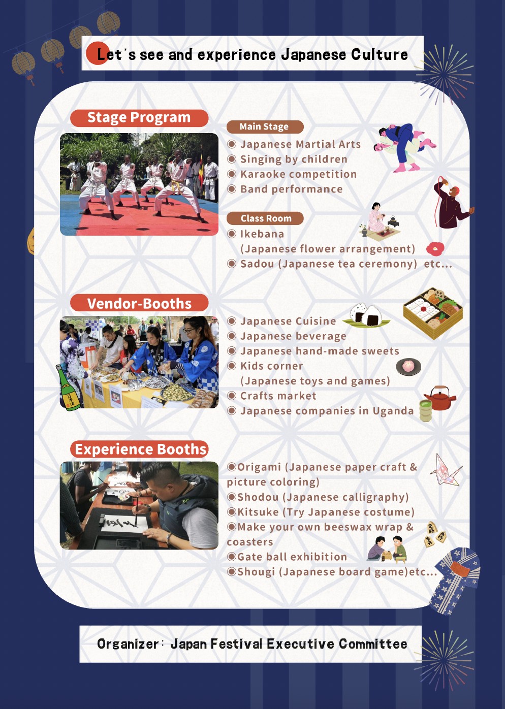 当日は、日本食レストランや企業、個人の方々が出店し、物販や企業紹介を実施。また、空手・柔道・野球・ゲートボールの各連盟によるデモや体験コーナーもあり、来場者でにぎわいました。ヨシノもブースを出し、会社紹介やビラ配りなどのPR活動を行いました。